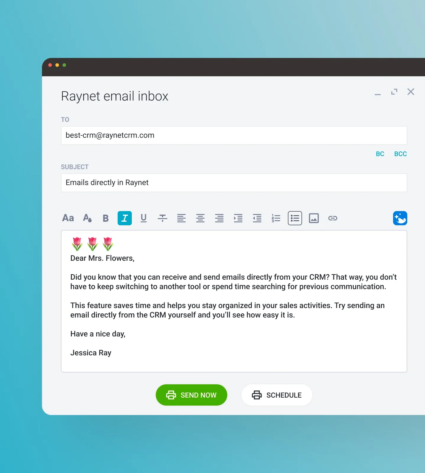 Set up your 2-way Raynet inbox integration by connecting to Gmail, Outlook, Microsoft 365, or any other IMAP provider in just a few clicks.